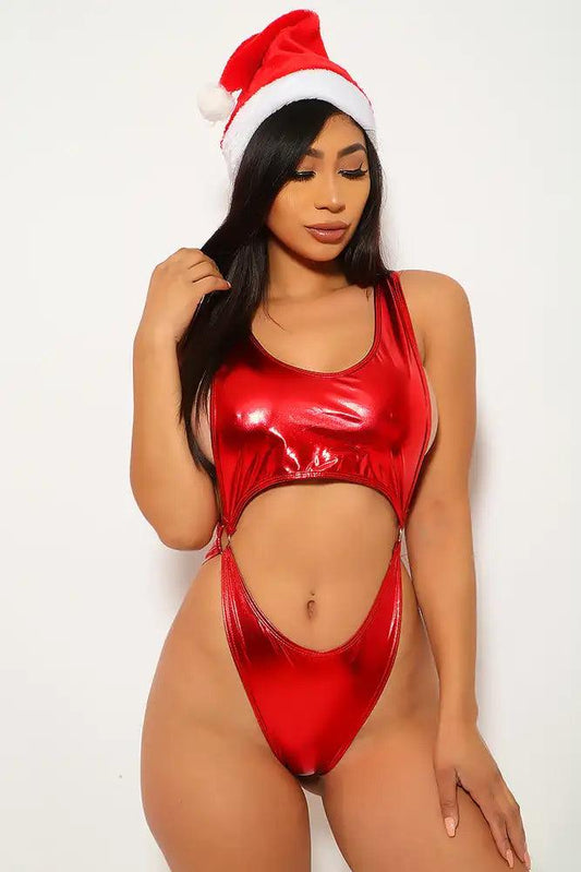 Red Metallic Faux Leather Cut Out Bodysuit