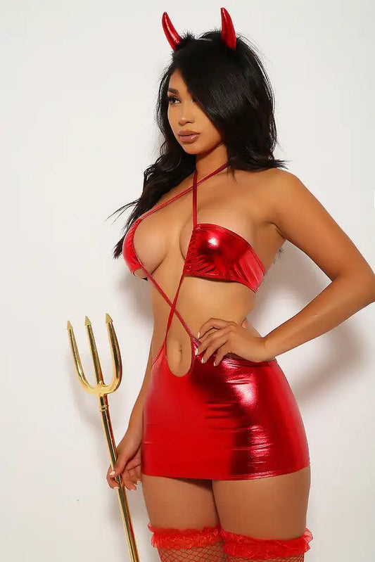 Red Metallic Sexy Devil Strappy Two Piece Costume Horns Included