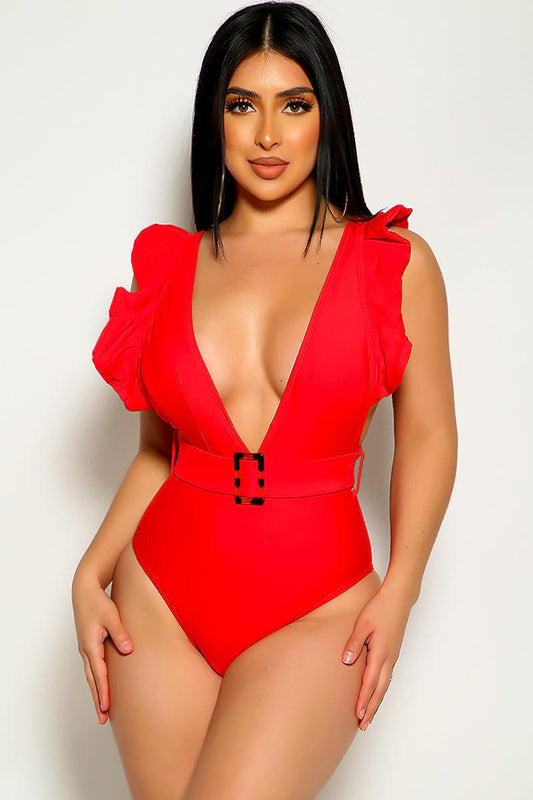 Red Ruffled Sleeves Belted One Piece Swimsuit