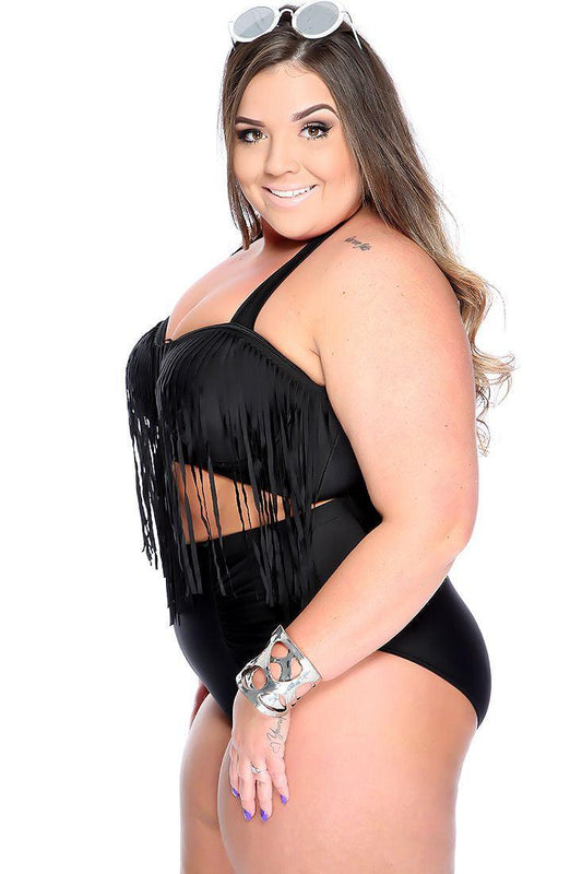 Sexy Black Padded Fringe High Waist Plus Size Swimsuit