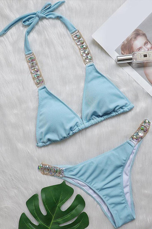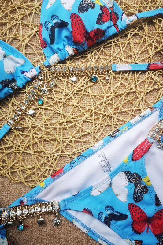Sexy Blue Butterfly Print Bikini With Gemstone Straps