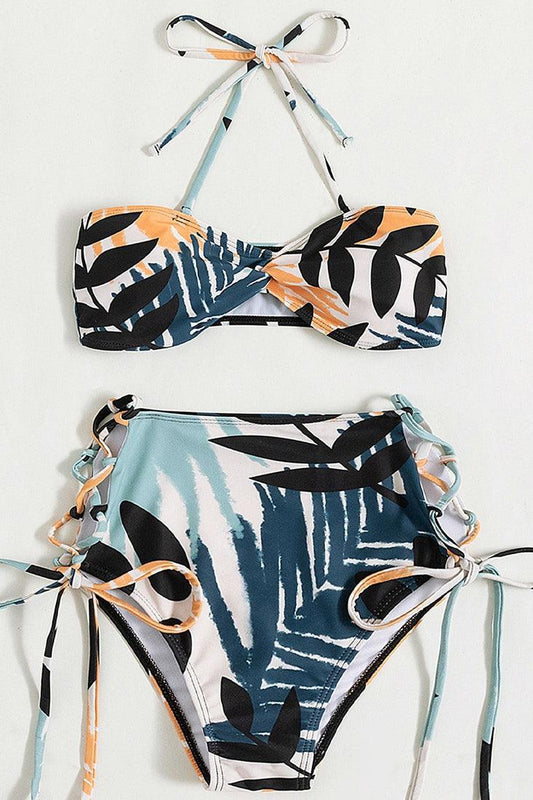 Sexy Blue Orange White Leaf Print 2pc Bikini