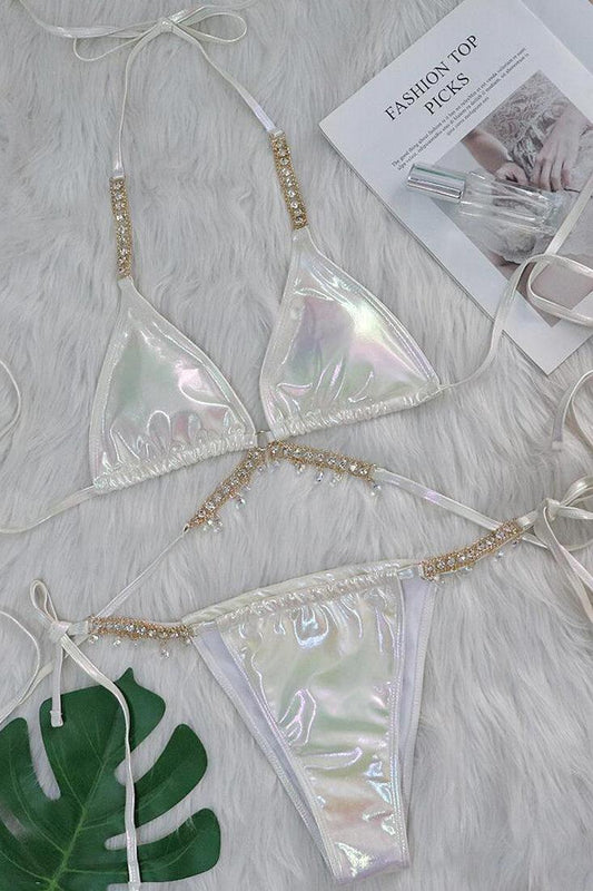 White Holographic Shiny Pearl Strappy Triangle Cheeky 2 Pc Sexy Swimsuit Set Bikini