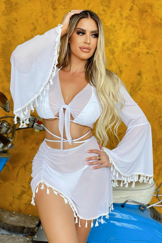 White Wrap Around Triangle Top Tassel Trim Cover Up 4 Pc Bikini Set