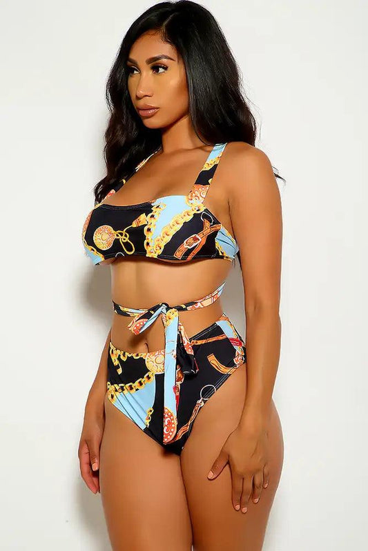 Black Strappy Graphic Print Two Piece Swimsuit