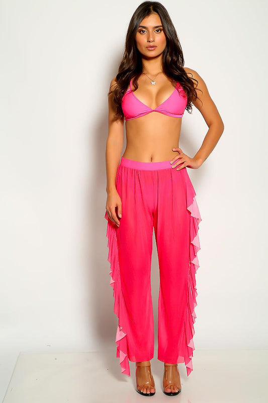 Fuchsia Layered Ruffle Detail Three Piece Swimsuit Cover Up