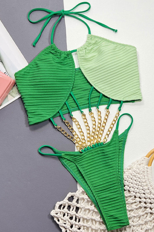 Green Color Block Gold Chain Strappy Cheeky 1pc Swimsuit Monokini