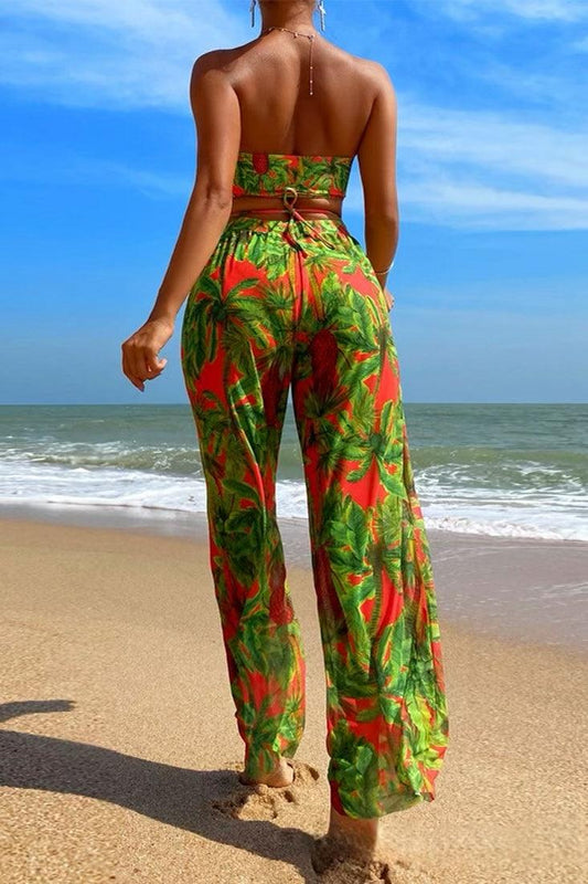 Green Red Palm Tree Print Bandeau High Waist Cheeky Pants Cover-Up 3Pc Swimsuit Set