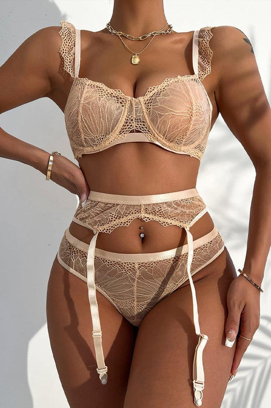 Beige Sheer Lace Ruffle Garter Sexy 3 Pc Lingerie Set