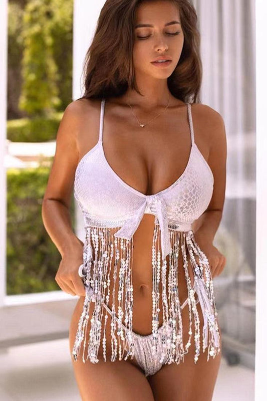 Metallic Silver Sequin Fringe 2 Pc Bikini Set