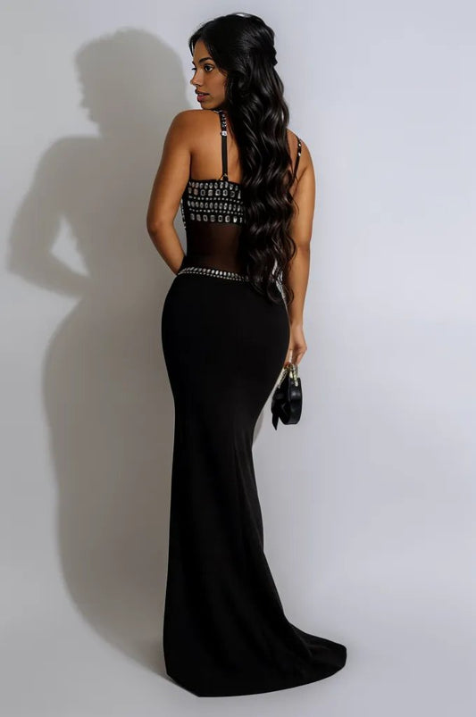Black Big Rhinestones Gem Mesh Sexy Fitted Mermaid Maxi Party Dress