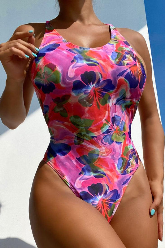Pink Multi Hibiscus Flower Butterfly Print Strappy Sexy Monokini Swimsuit