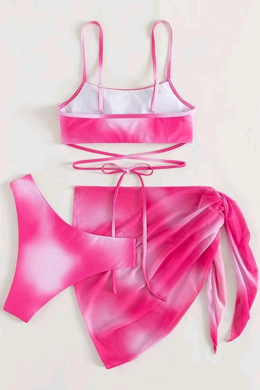 Pink Tie Dye Print Criss-Cross 3 Pc Bikini Set With Cover Up