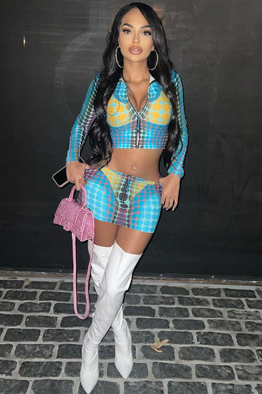 Sexy 2pc Blue Polkadot Rainbow Dress Set