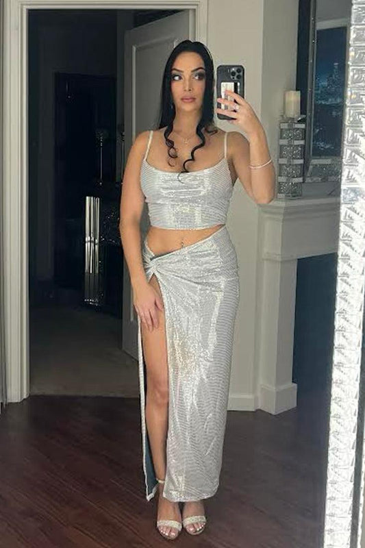 Silver Sleeveless Cropped Metallic Sequin Knotted Two Piece Dress