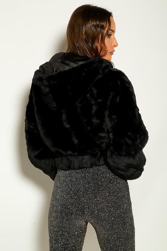 Black Faux Fur Zip Up Fluffy Hoodie Jacket
