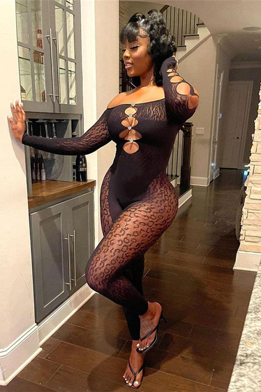 Sexy Black Stretchy Mesh Rhinestone Button Bodysuit Jumpsuit