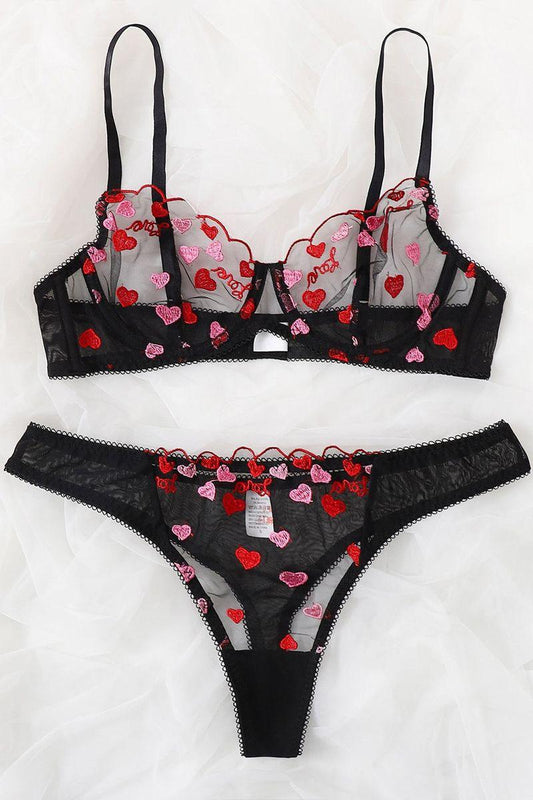 Black Heart Print Mesh Sexy Two Piece Lingerie