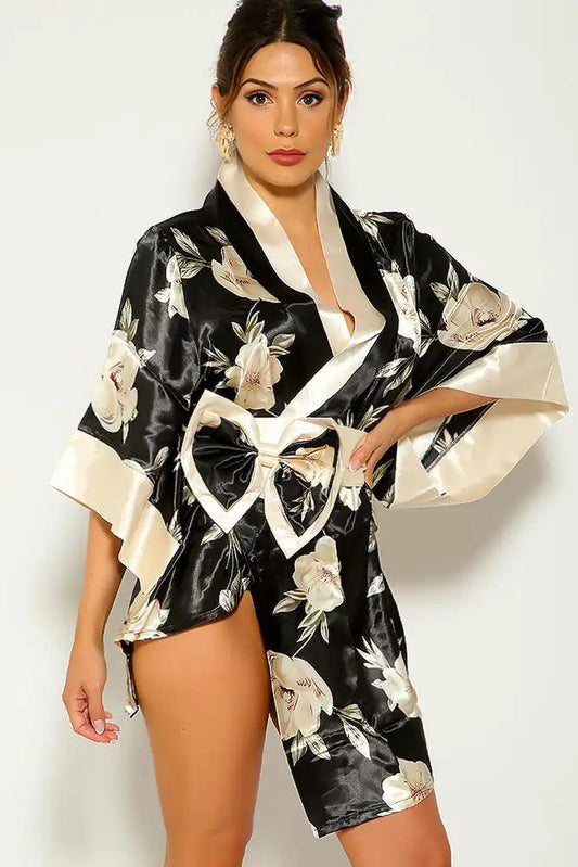 Black White Sexy Floral Print Traditional Japanese Kimono 3pc Sexy Costume