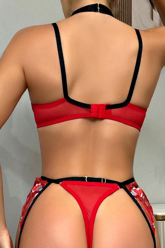 Red Black Heart Embroider Mesh Choker Thong Garter Belt 5Pc Lingerie Set