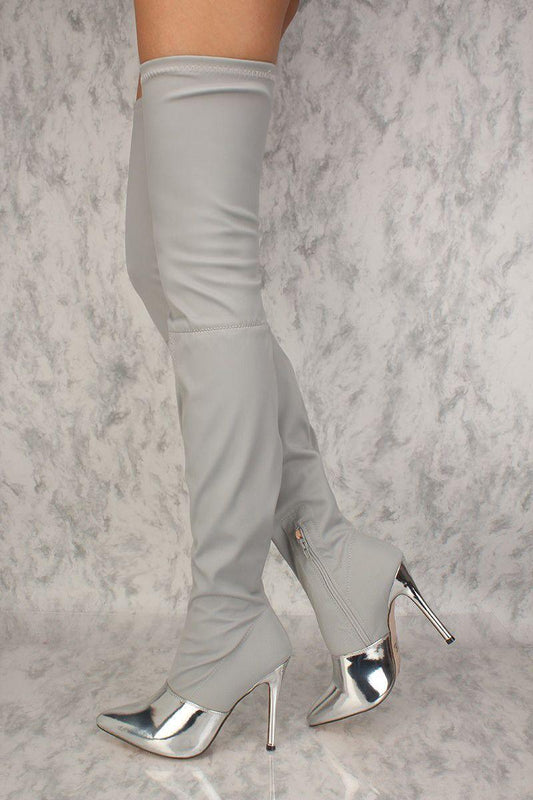 Sexy Silver Mirror Pointy Toe Thigh High Heel Boots Lycra