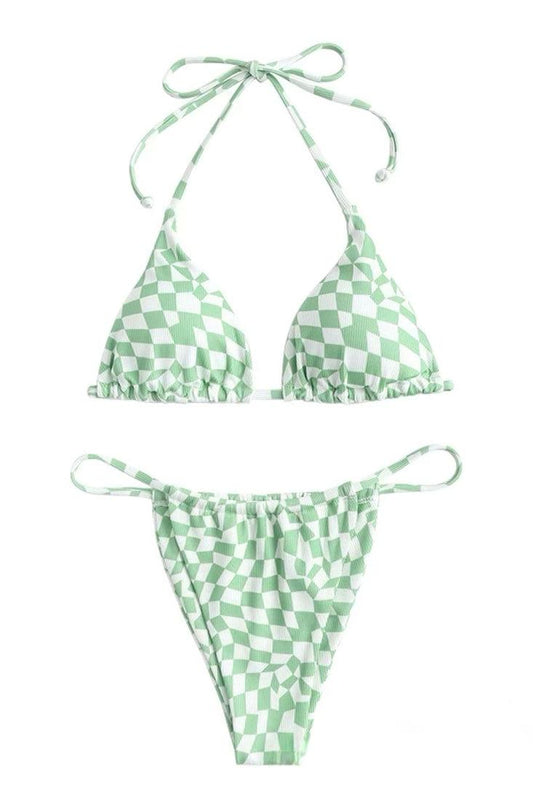 Sage Green Checker Printed Draw String Cheeky 2Pc Sexy Swimsuit Set Bikini