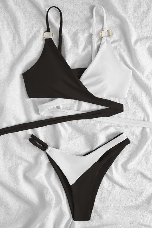 Black White Cross Strappy Cheeky 2Pc Sexy Swimsuit Set Bikini