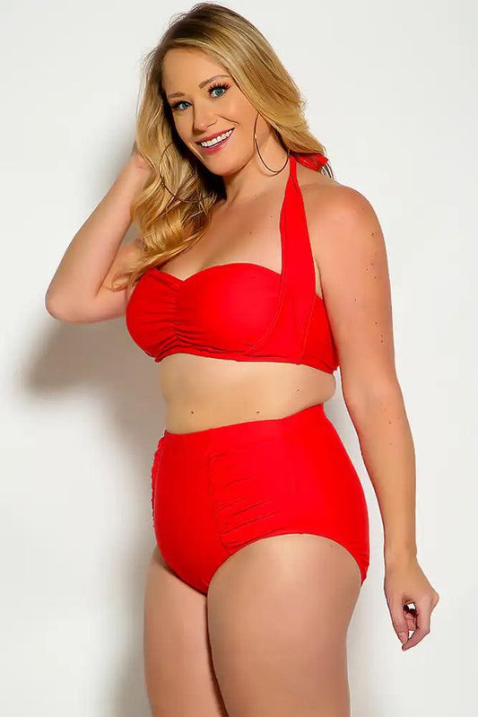 Red Bold Halter Top Ruched High Waist Two Piece Swimsuit Plus