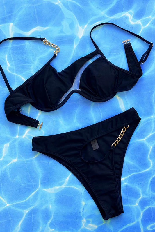 Black One Shoulder Mesh Gold Chain Cut-Out 2Pc Sexy Swimsuit Bikini