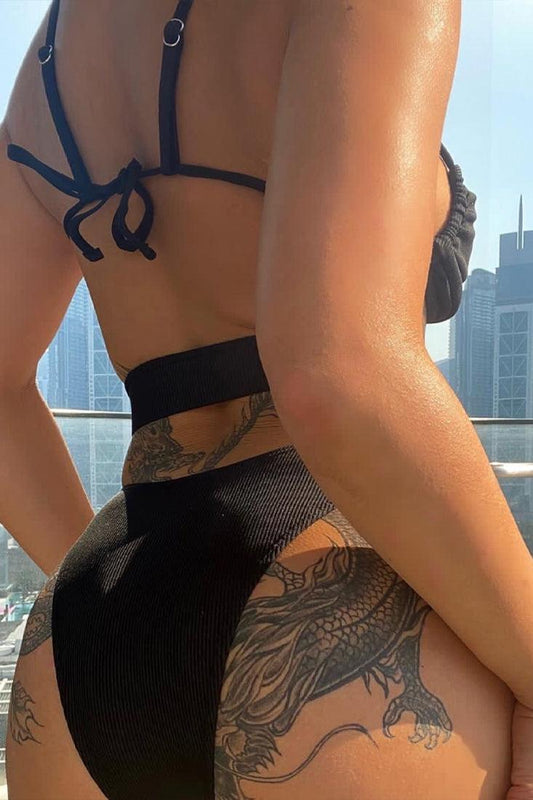 Black Ribbed Thick Strappy Cut-Out High-Waist Cheeky Sexy 2Pc Swimsuit Set