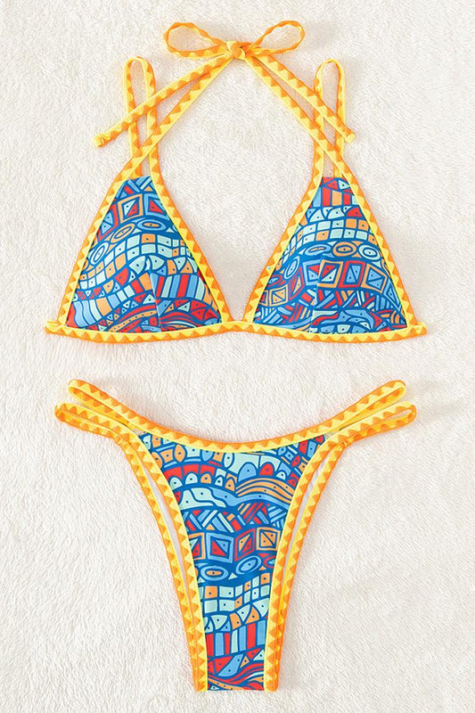 Blue Print Orange Crochet Trim Triangle Cheeky 2Pc Swimsuit Set Micro Bikini