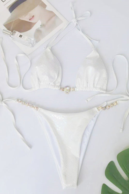 White Snake Rhinestone Halter Ultra Sexy Ruched Cheeky 2 Pc Swimsuit