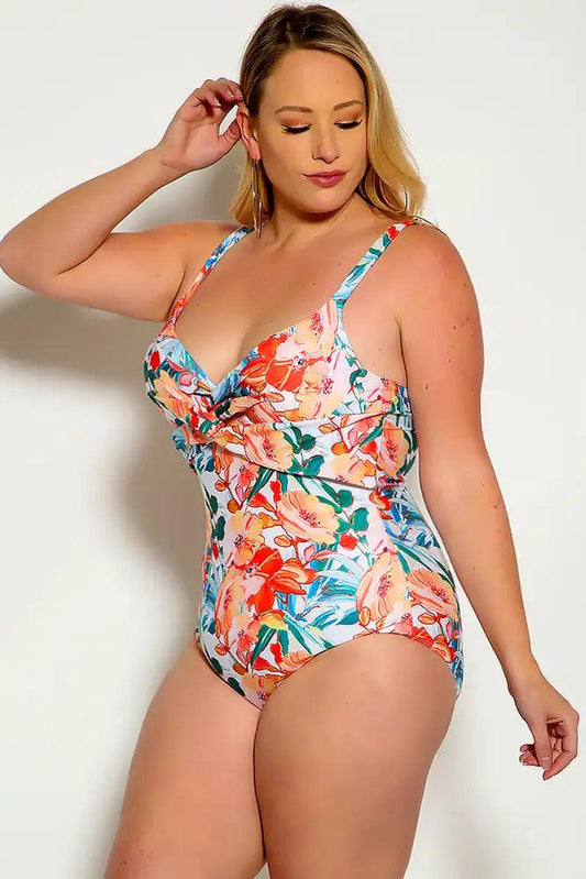Sexy White Orange Floral Leaf Print Padded One Piece Swimsuit