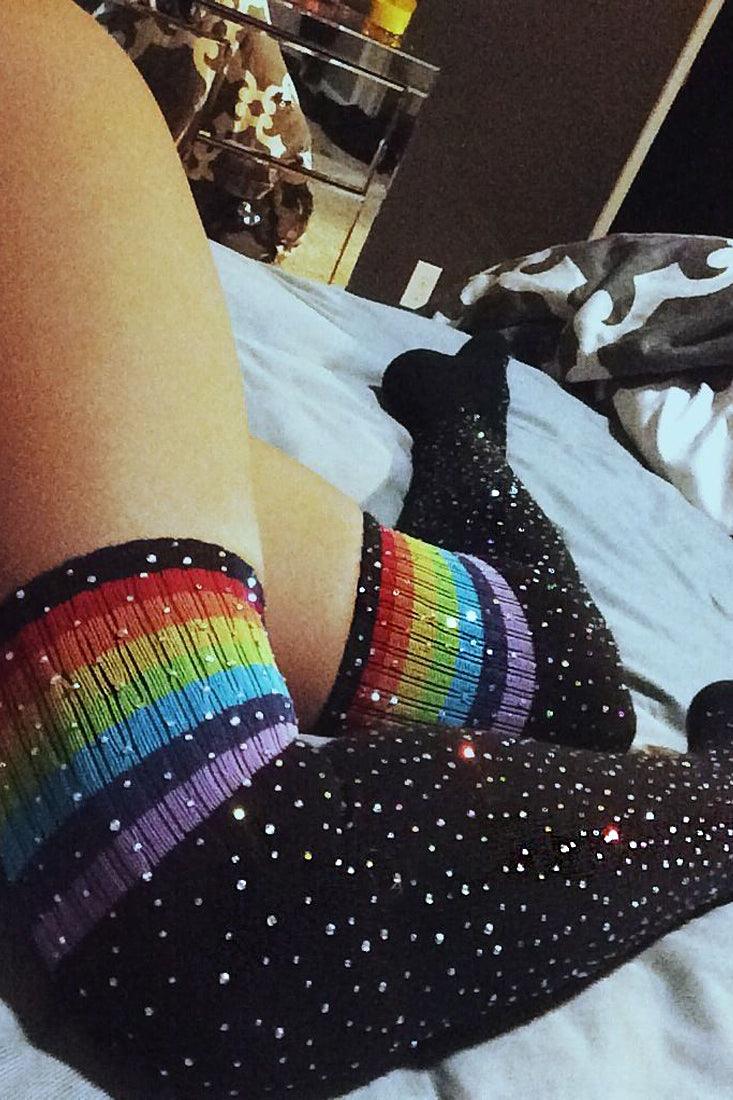 Black Rainbow Striped Rhinestone Thigh High Socks