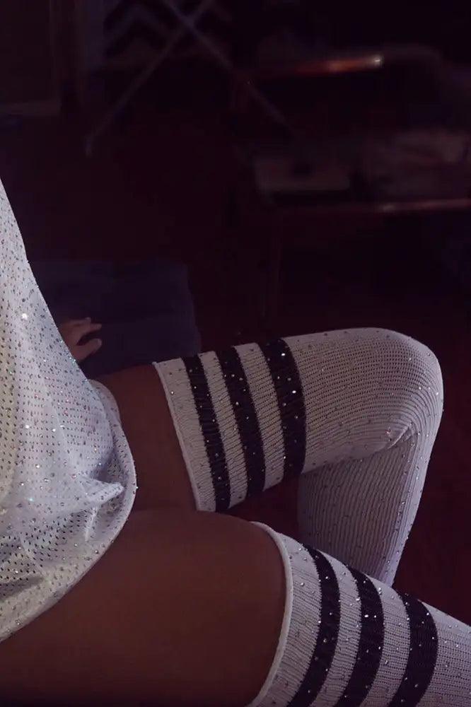 White Black Striped Rhinestone Thigh High Socks