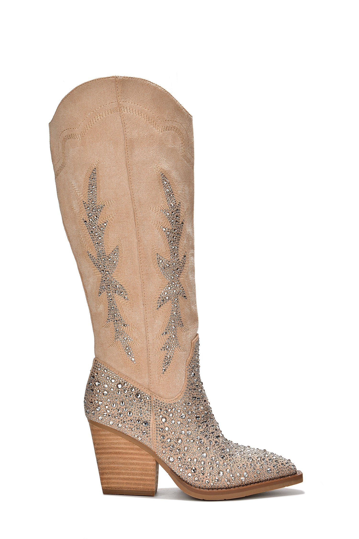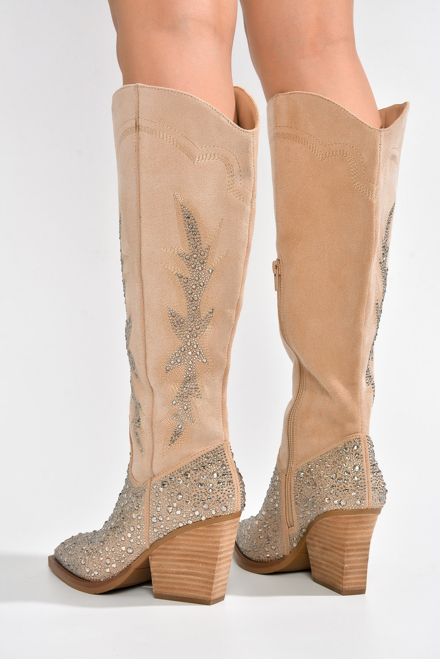 Elevate your wardrobe when you add Anniston boots to your closet. Features a velvety suede finish,shiny rhinestone accents,and a knee-high silhouette. These Western-inspired boots know how to kickstart a fun night. Comes in silver,black,or ivory.