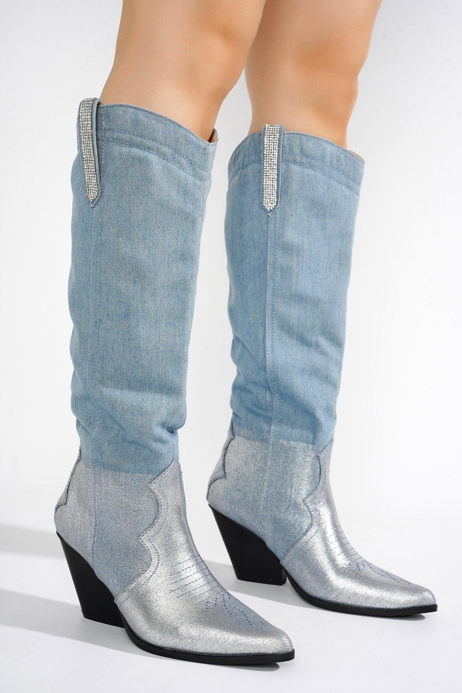 Yee to the Haw! Castine is a modern take on a timeless classic. Features a chic spray-on denim,18 inch knee-high shaft,sparkling rhinestone trim,and embroidery on the vamp. The stacked heel adds extra height and boosts your confidence. Available in silver or gold.