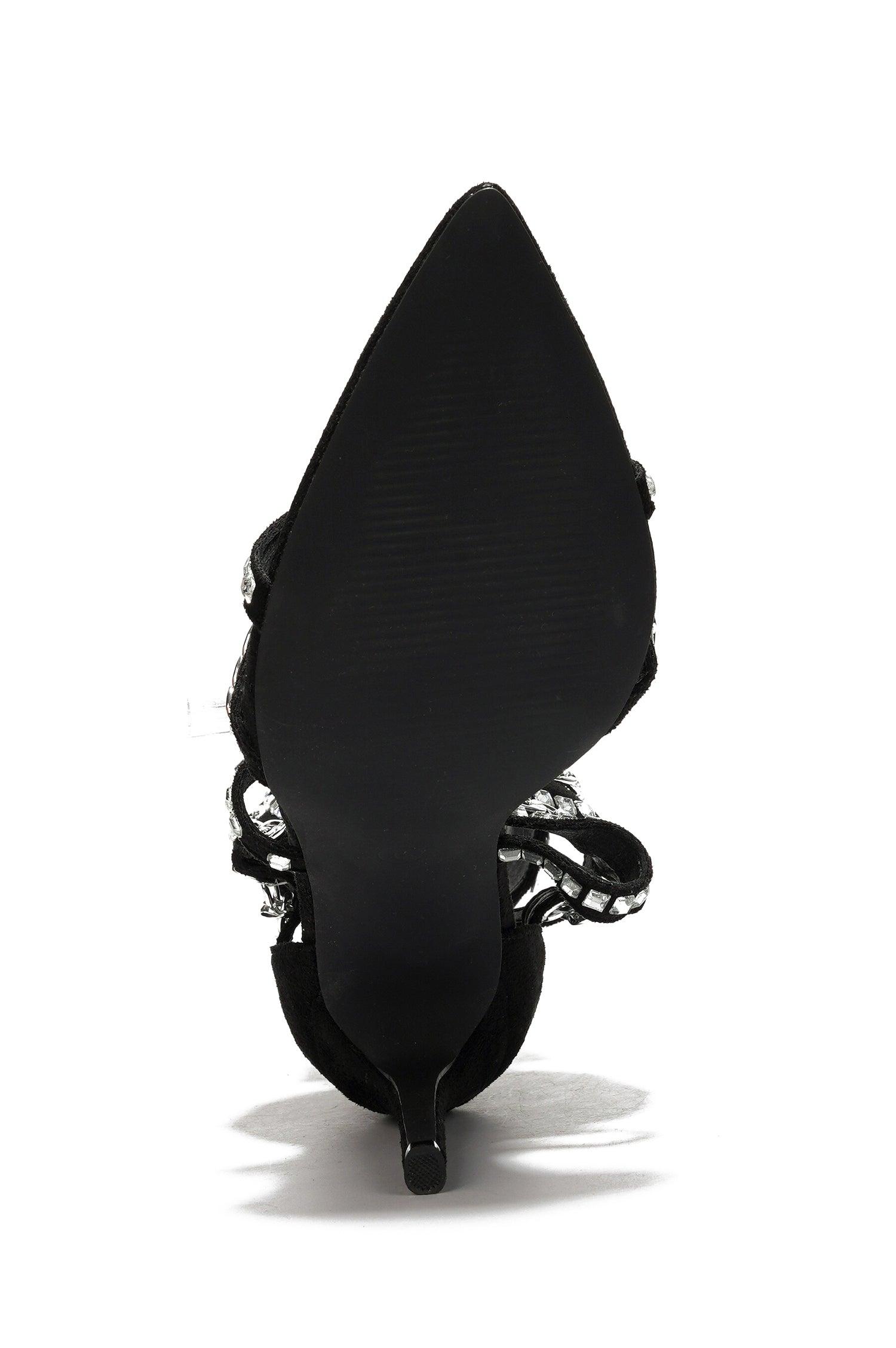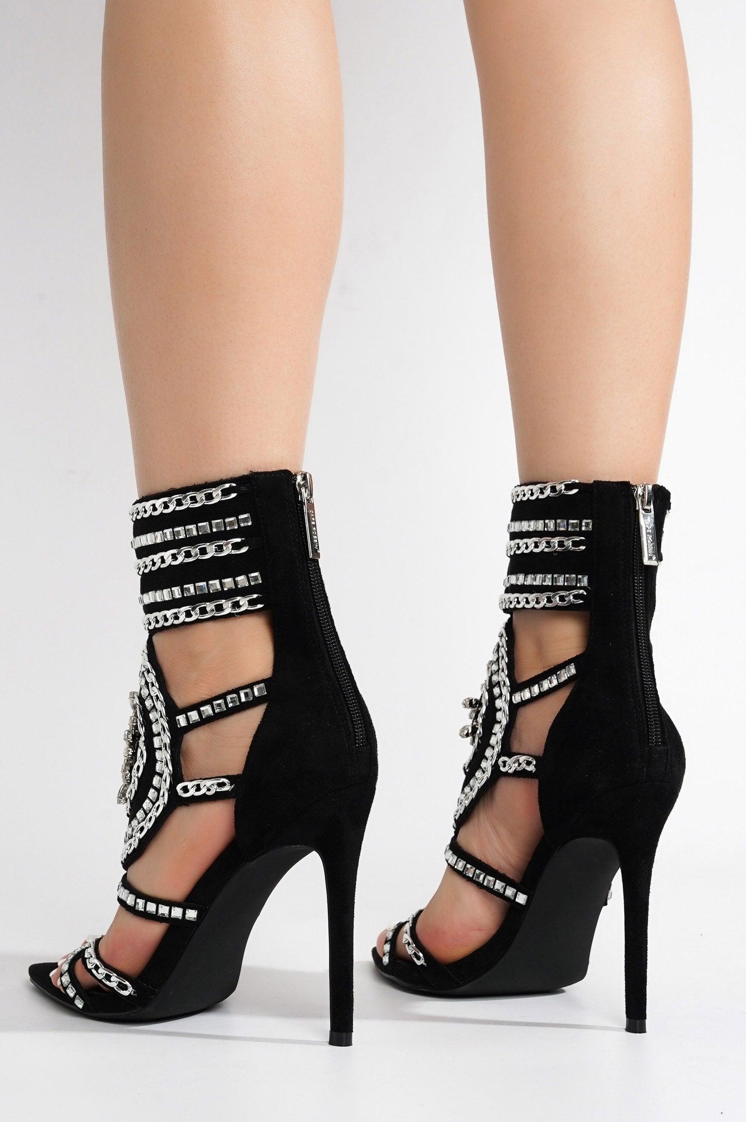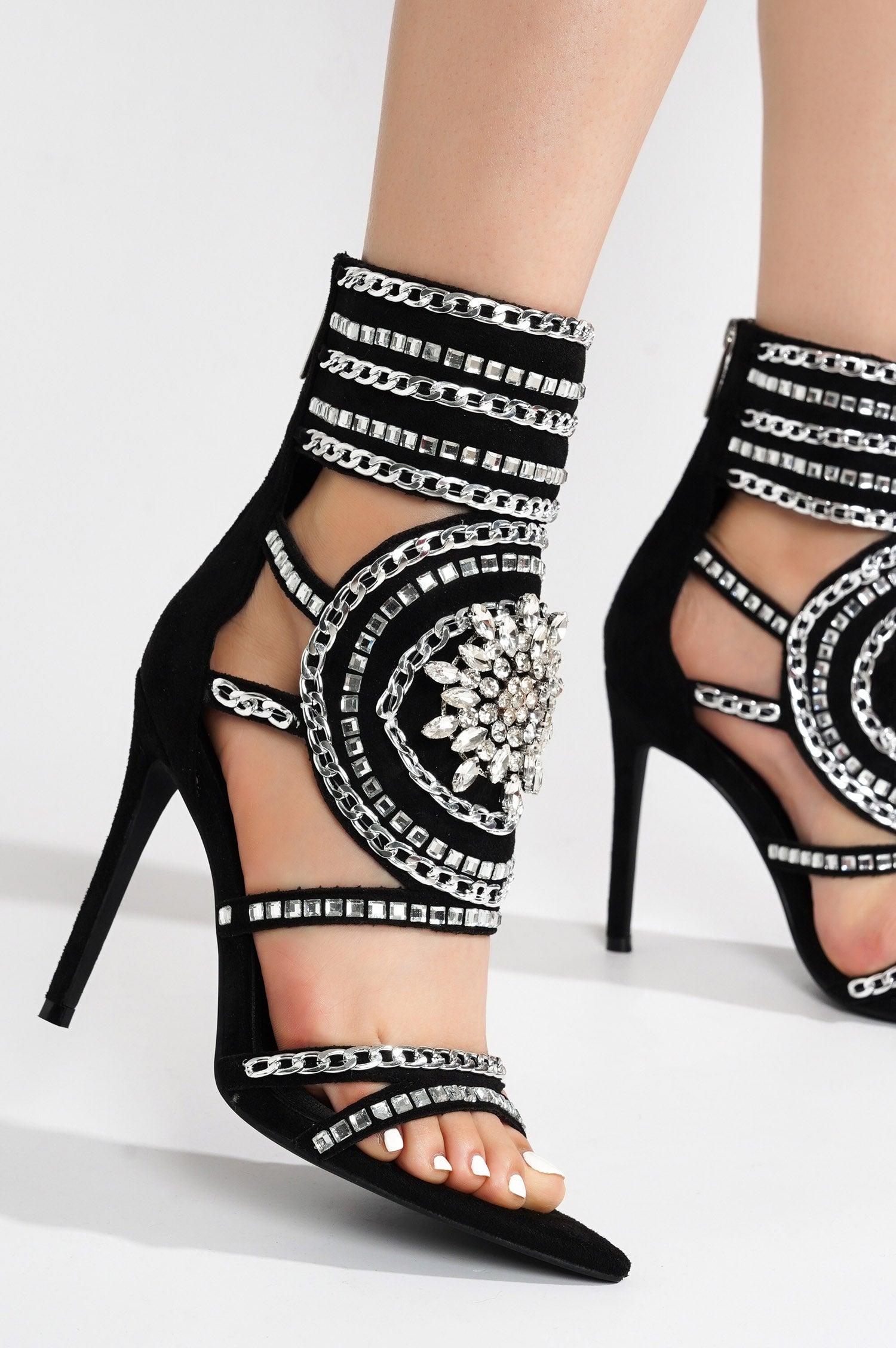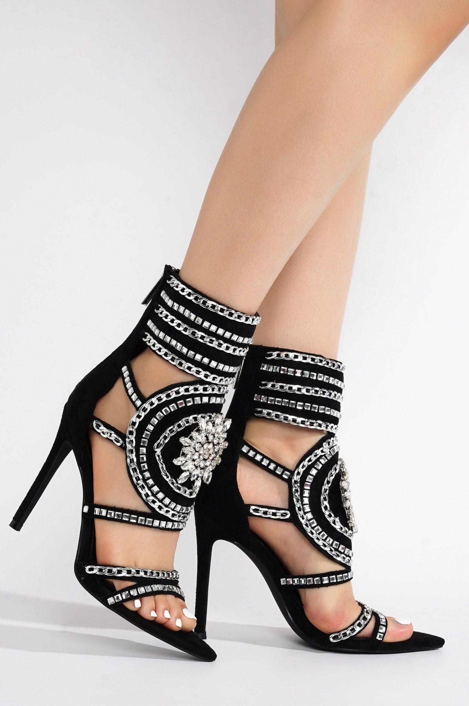 These heels demand attention! Clarysalyn adds extra confidence to your step. Features a brilliant gem brooch on the vamp for a memorable vibe,chain-trimmed multi-straps for a touch of edge,and sturdy high heels to balance the perfect look. Comes in black,white,pink,orange,or green.