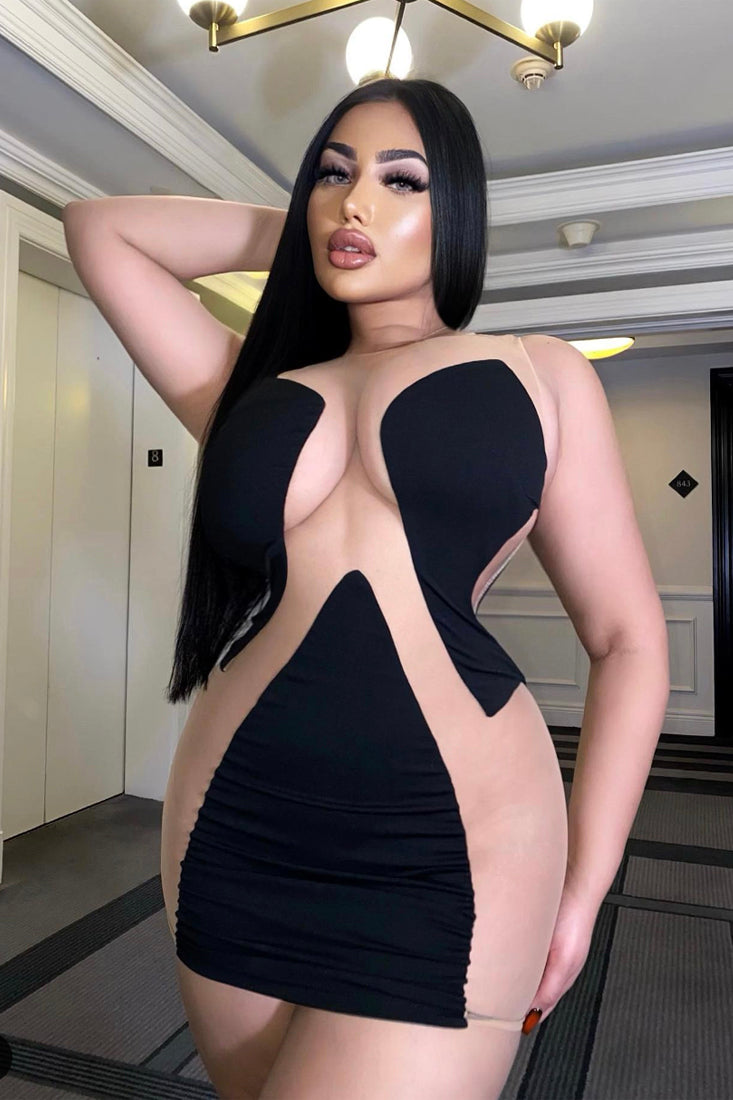 this sexy dress is fabulous to wear at a night out. Featuring; sleeveless, round neckline, opaque design detail. mesh, two tone. Followed by a fitted wear