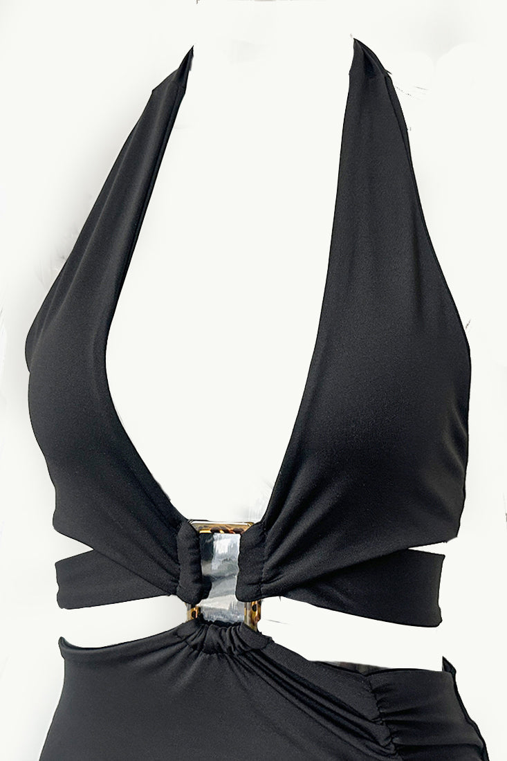 Black Halter Cut-Out Strappy Buckle Ring Sexy Maxi Party Dress