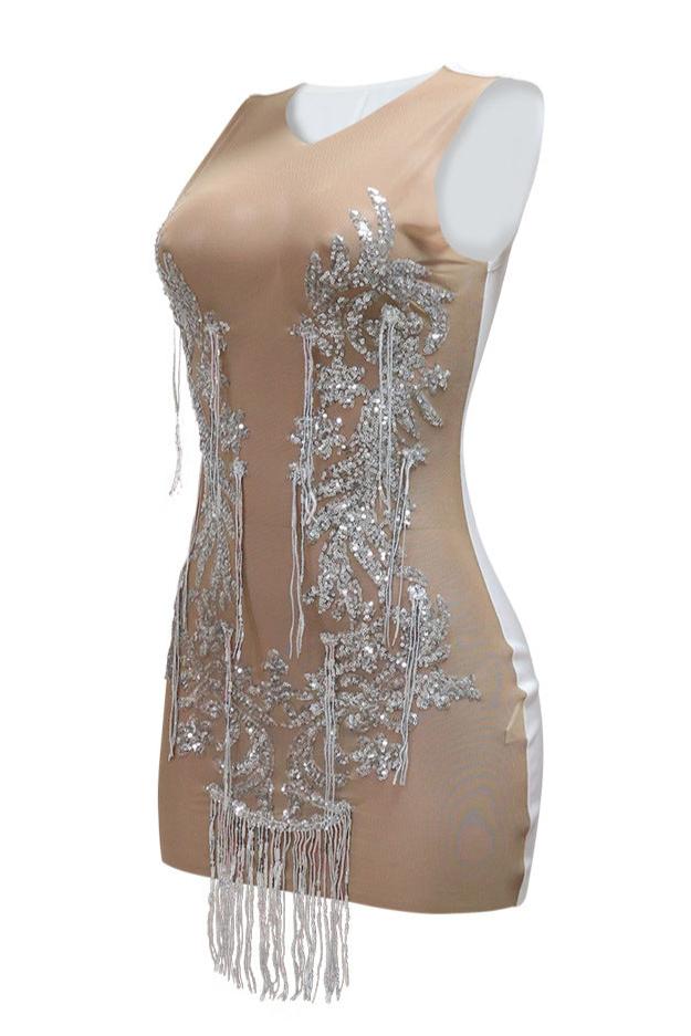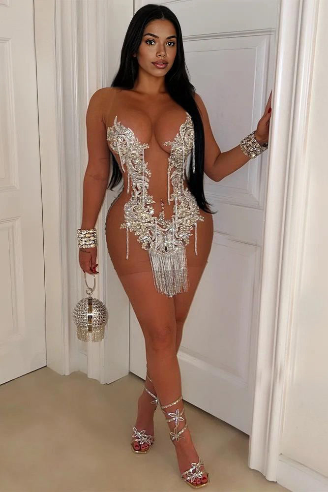White Sequin Fringe Nude Sheer Mesh Sexy Fitted Party Dress