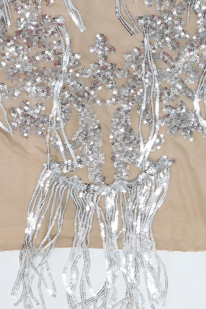 Be the life of the party with this stunning Silver Sequin Fringe Nude Sheer Mesh Sexy Fitted Party Dress! The silver sequin fringe adds a touch of glamour, while the sheer mesh keeps things flirty. Perfect for any special occasion, this dress will make you stand out in the best way possible. Time to shine!
