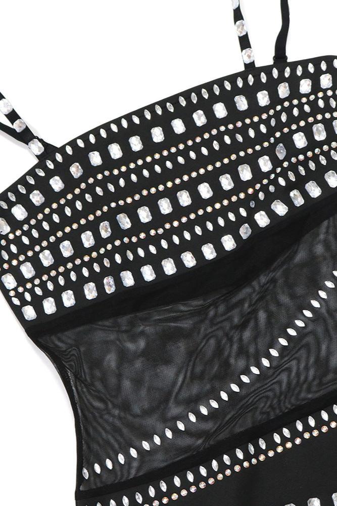 Black Big Rhinestones Gem Mesh Sexy Fitted Mermaid Maxi Party Dress