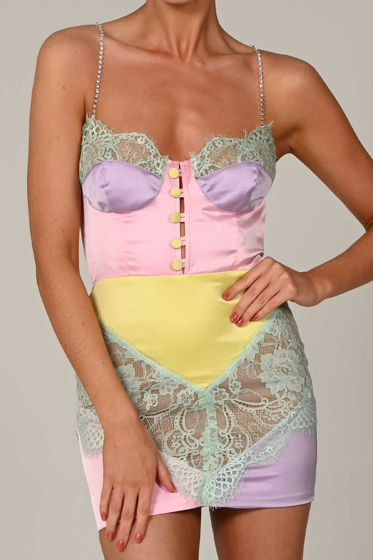 Get ready to party in this Pink Lavender Satin Lace Rhinestone Strap Buttons Dress! With its playful color block and eye-catching rhinestone accents, you'll be the center of attention. The satin and lace fabric adds a touch of elegance to this sexy party dress, perfect for any occasion.
