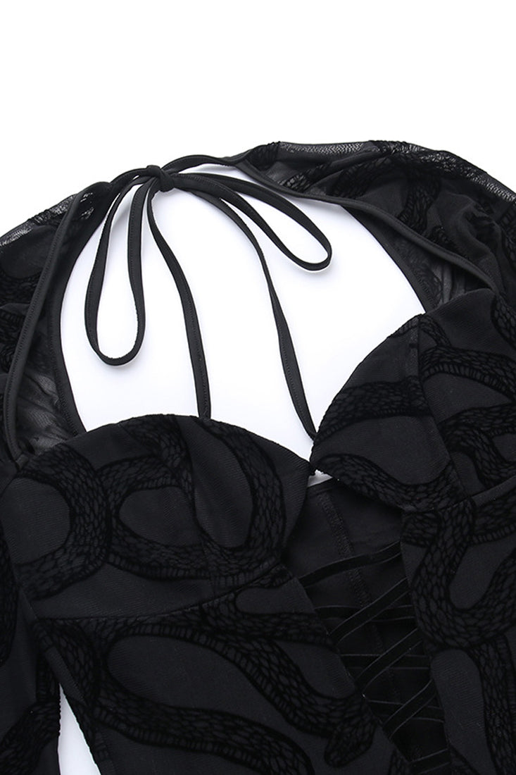Black Lace Velvet Cut-Out Lace-Up Long Sleeve Sexy Fitted Dress