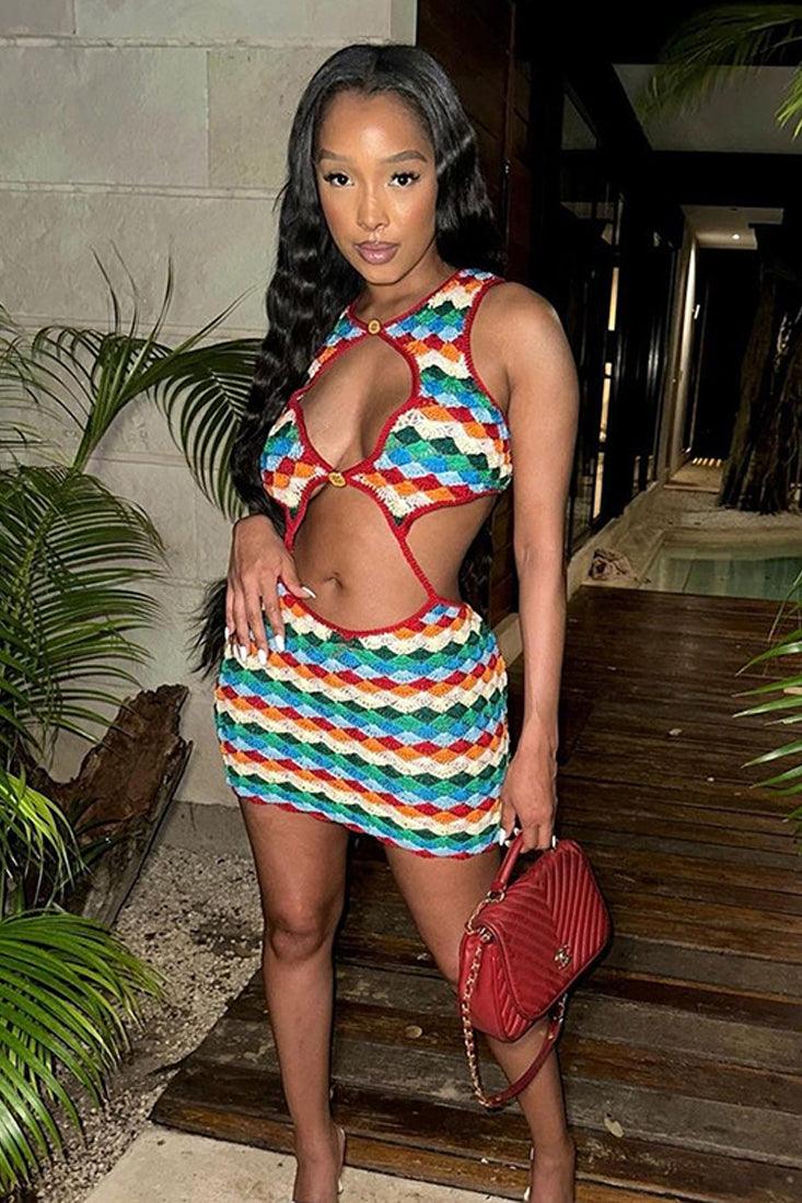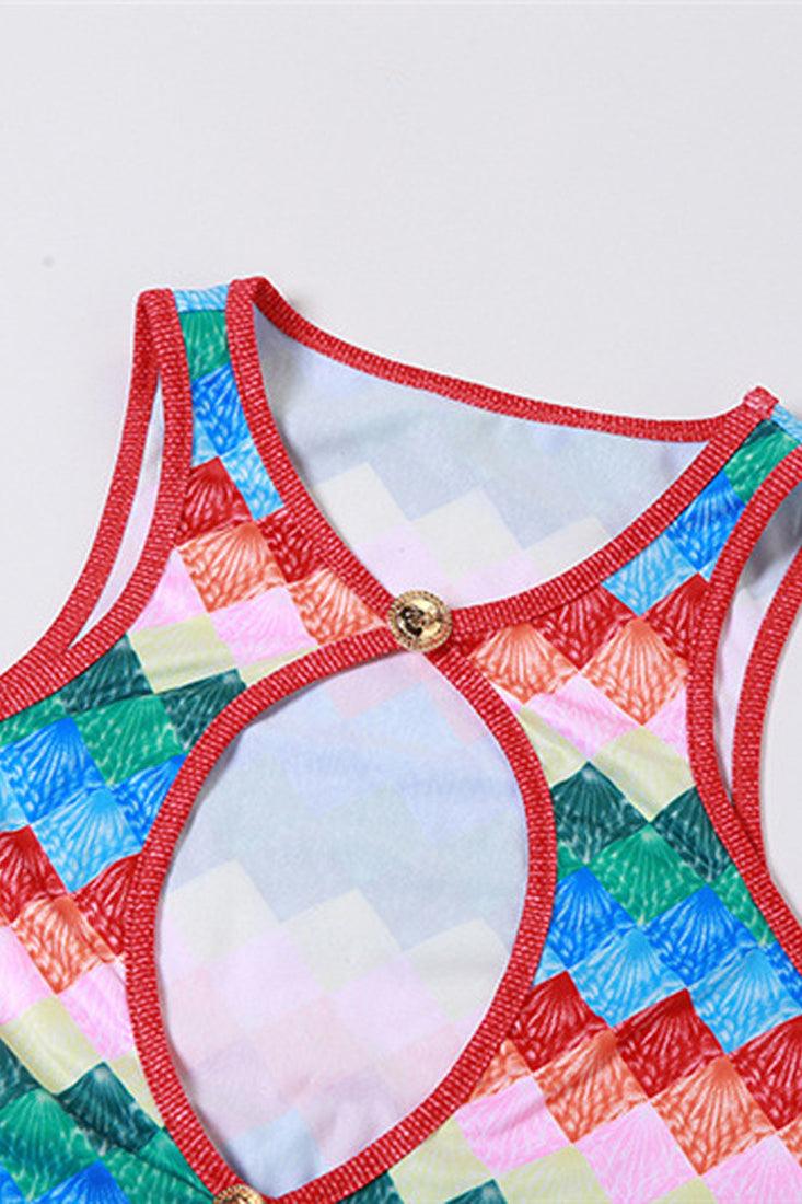 This Red Multi Printed Gold Button Cut Out Party Dress is a fashionable and eye-catching choice for all special occasions. Crafted with a luxe printed-cotton blend fabric for a comfortable and lightweight feel, it features gold button accents and an alluring cut-out design. Perfect for a wedding, cocktail party, or other celebratory event.