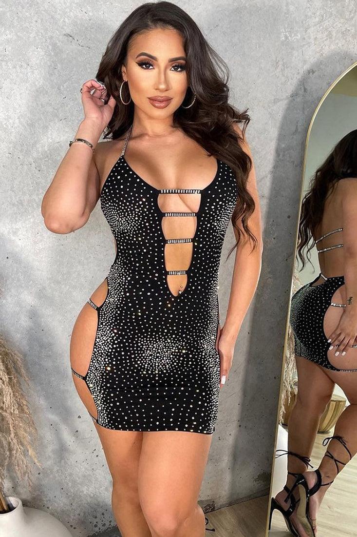 Black Silver Rhinestones Cut Out Mini Party Dress