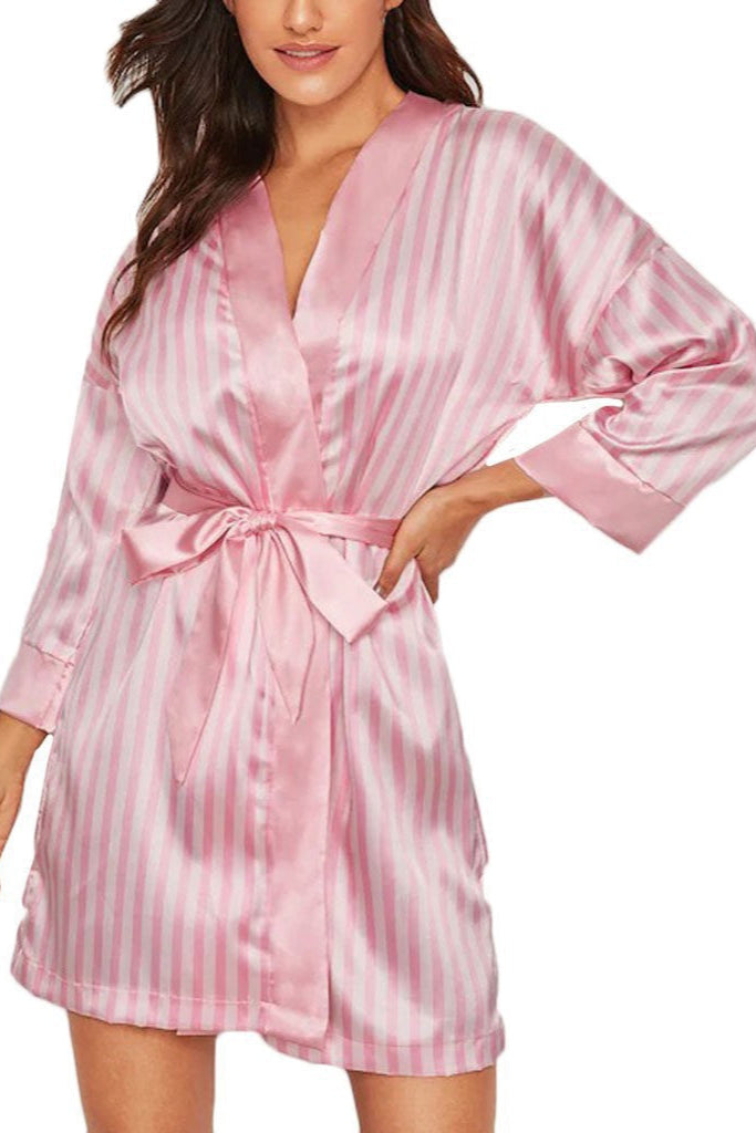 Pink Stripes Satin 2Pc Robe Sexy Lingerie Set