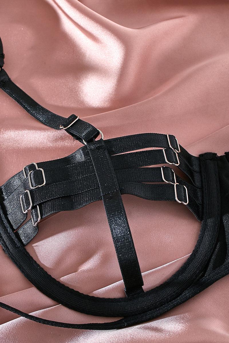 Black Cut Out Underwire Garter Cheeky Thong Lingerie Set