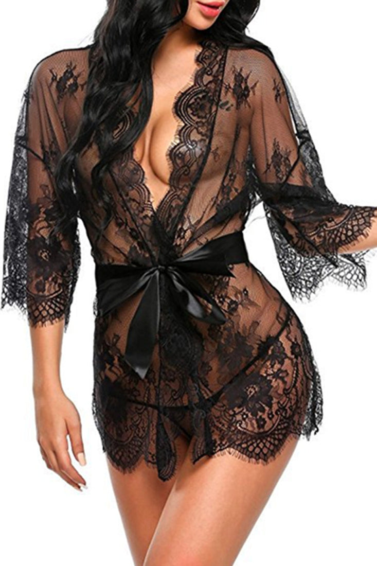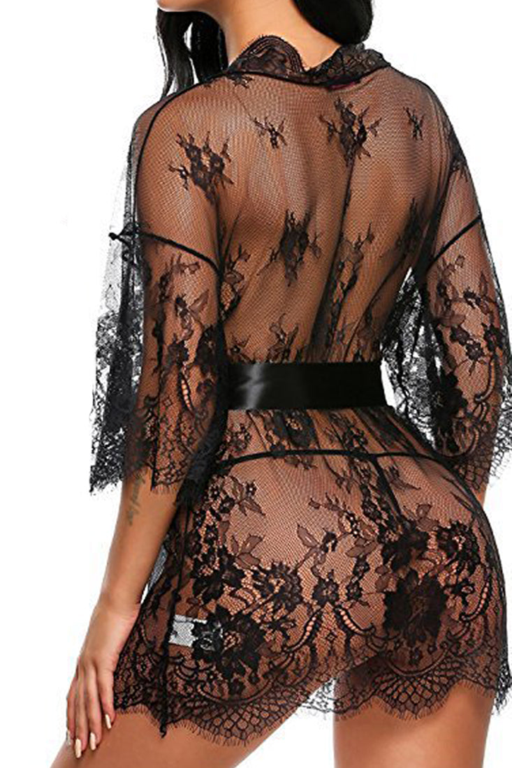 Black Lace Embroidered Robe Thong Belt 3Pc Lingerie Set
